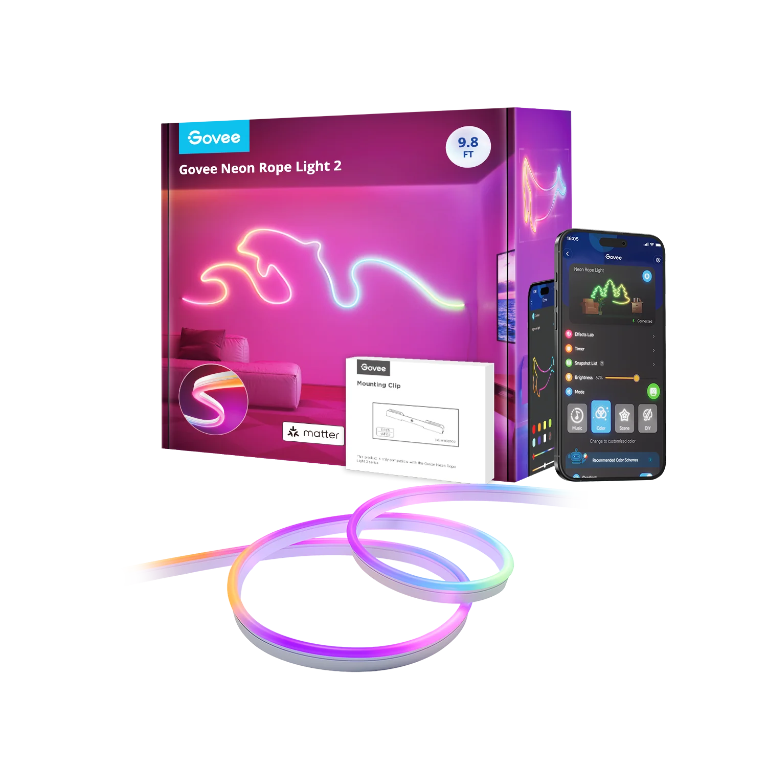 The Govee Neon Rope Lights 2 brings vibrant, flexible neon-style illumination to your space, perfect for creating eye-catching outlines, signs, and architectural accents. This bendable LED rope delivers continuous, even lighting that transforms any surface into a modern design statement.